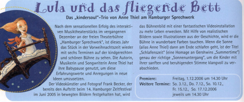 1. bis 3. Klasse: Interaktive musikalische Lesung zum Taschenbuch »Lula hebt ab« mit Handpuppe. Ich lese Passagen aus dem Taschenbuch und singe (zusammen mit den Kindern) meistens zwei bis drei Songs der dazugehörigen CD. Außerdem basteln wir Kazoos, die wir anschließend (im Rahmen eines Songs) gemeinsam ausprobieren. Begleitend präsentiere ich Illustrationen der Geschichte mit einem Beamer.